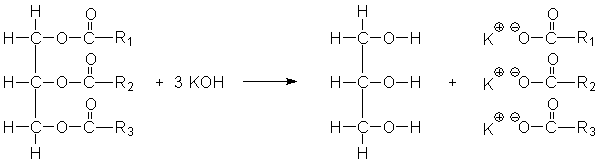 - Erläutern Sie das Prinzip mit Hilfe einer Reaktionsgleichung. Kennzeichnen Sie dabei den Glycerinteil des Fettes als RF. Nehmen Sie Buttersäure (Butansäure) als "Gegenstück".